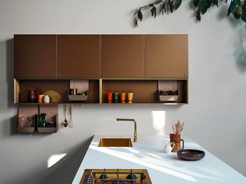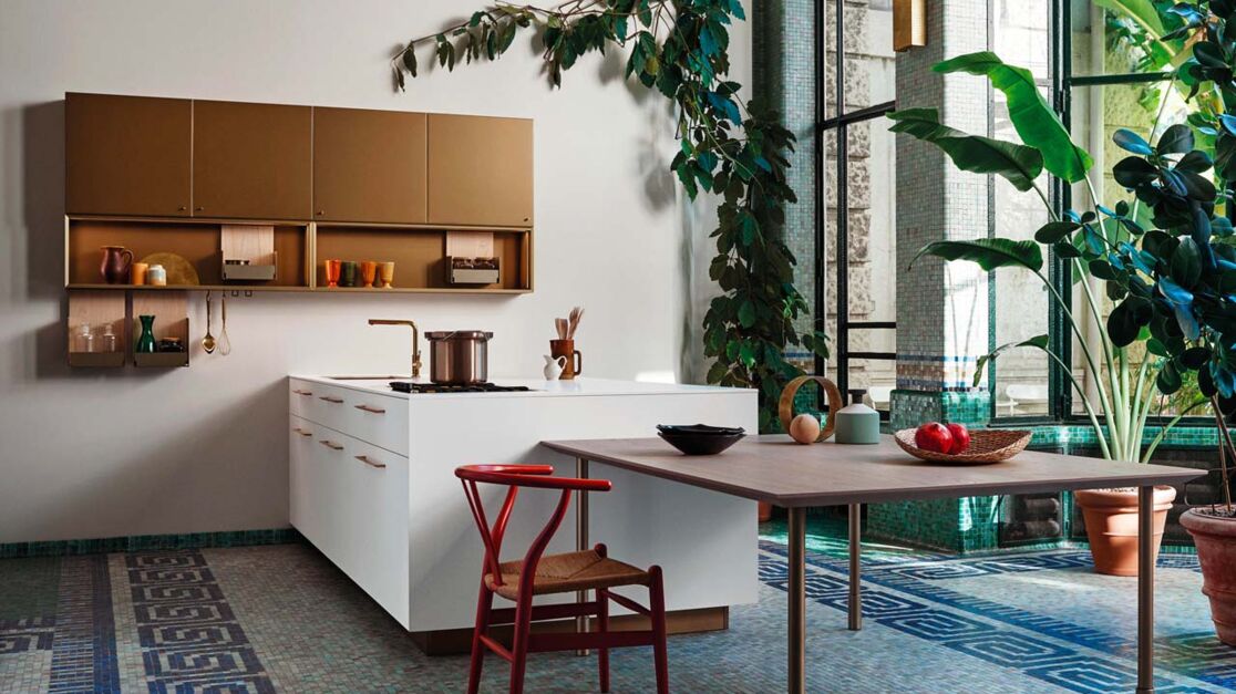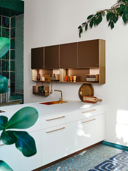 The photo shows the beloved system in new materials and finishes. The Technomat Meringa doors match perfectly with the champagne-coloured Eero handle and the Fenix Bianco Kos worktop with the storage systems.