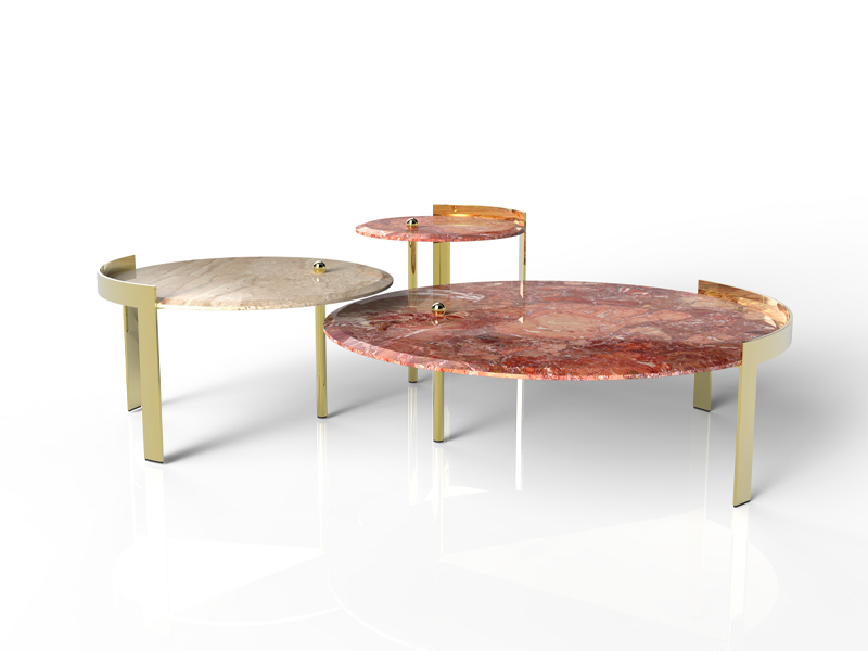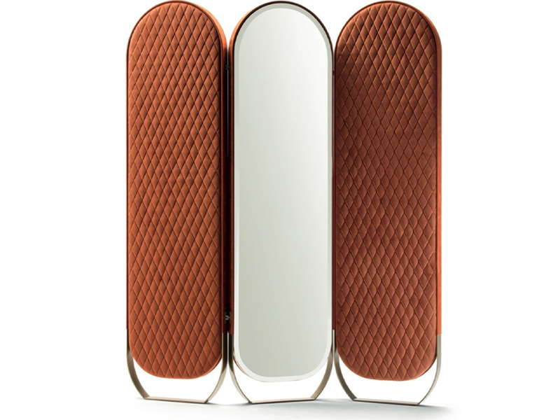 Dorothy is a timeless collection with distinctive art deco elements. In line with the Total look concept, the designers recommend complementing the bed with the Mascha screen with central mirror and the Brian coffee tables. The graphic embroidery of the screen, the rounded shapes of the table tops and the distinctive geometry of the brass legs combine to create a seamless, glamorous interior.