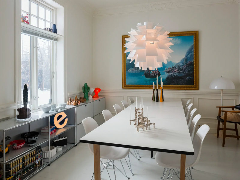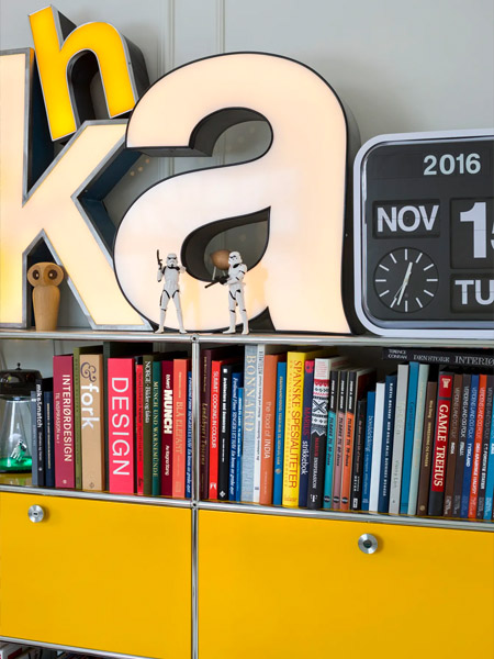 This interior is designed for a Norwegian family who live in a traditional wooden house with attractive decorative motifs. White walls and floors absorb maximum light and harmonise perfectly with the outside landscape. And the greyness of the long winter evenings is diluted by the family with bright inclusions: the yellow bookcase, the blue toy cabinet, the white multimedia unit, the green kitchen furniture. This is all minimalist and flexibly combined Haller.