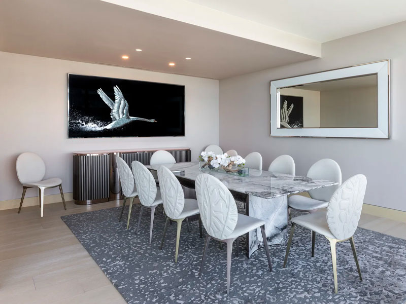 The centrepiece of the dining area is the brand icon, the Kerwan table. The particularity of the model lies in the curvature of the legs, which are made of marble slab rather than solid block, thus avoiding unnecessary waste. The steel and stone of the base optically merge with each other. A marble tabletop completes the sculptural design. The table is presented in combination with the Astrid chairs and Thamos sideboard (designed by Alessandro La Spada), and the Boreal 9 chandelier (designed by Marco Piva), which adds a luxurious touch to the entire composition.