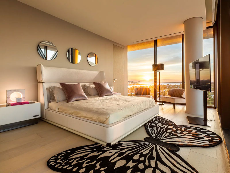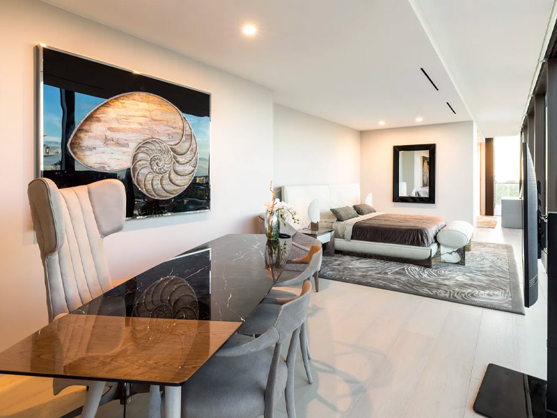 The furnished Visionnaire penthouse is split over three levels and occupies the upper floors of the complex, totalling over 700 sqm. It is a space with 5 bedrooms, 5 bathrooms and a private rooftop pool.