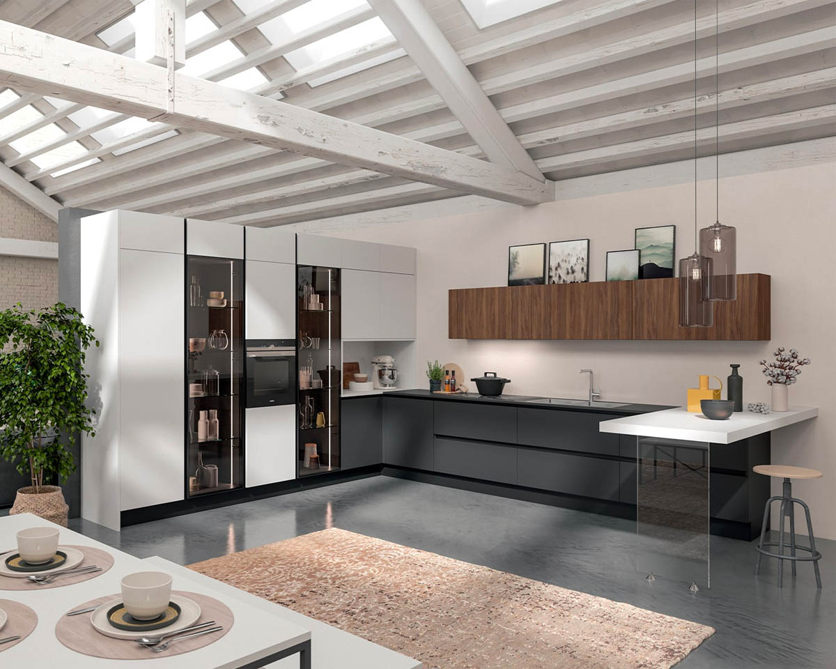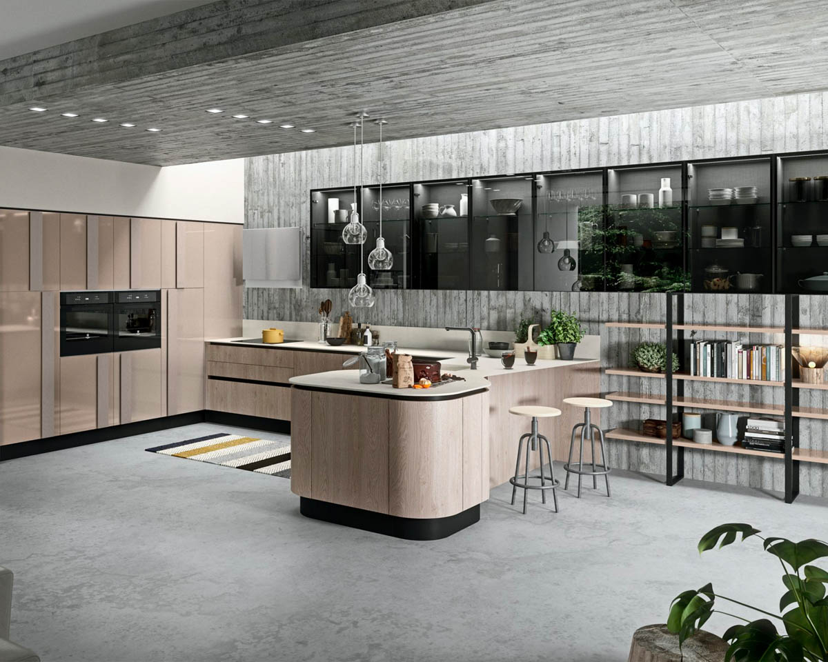 Современная модель итальянской фабрики Aran, в которой глянцевые фасады сочетаются с текстурами натурального дерева.