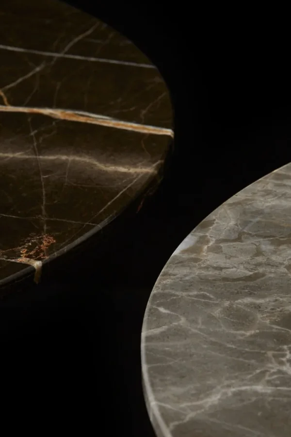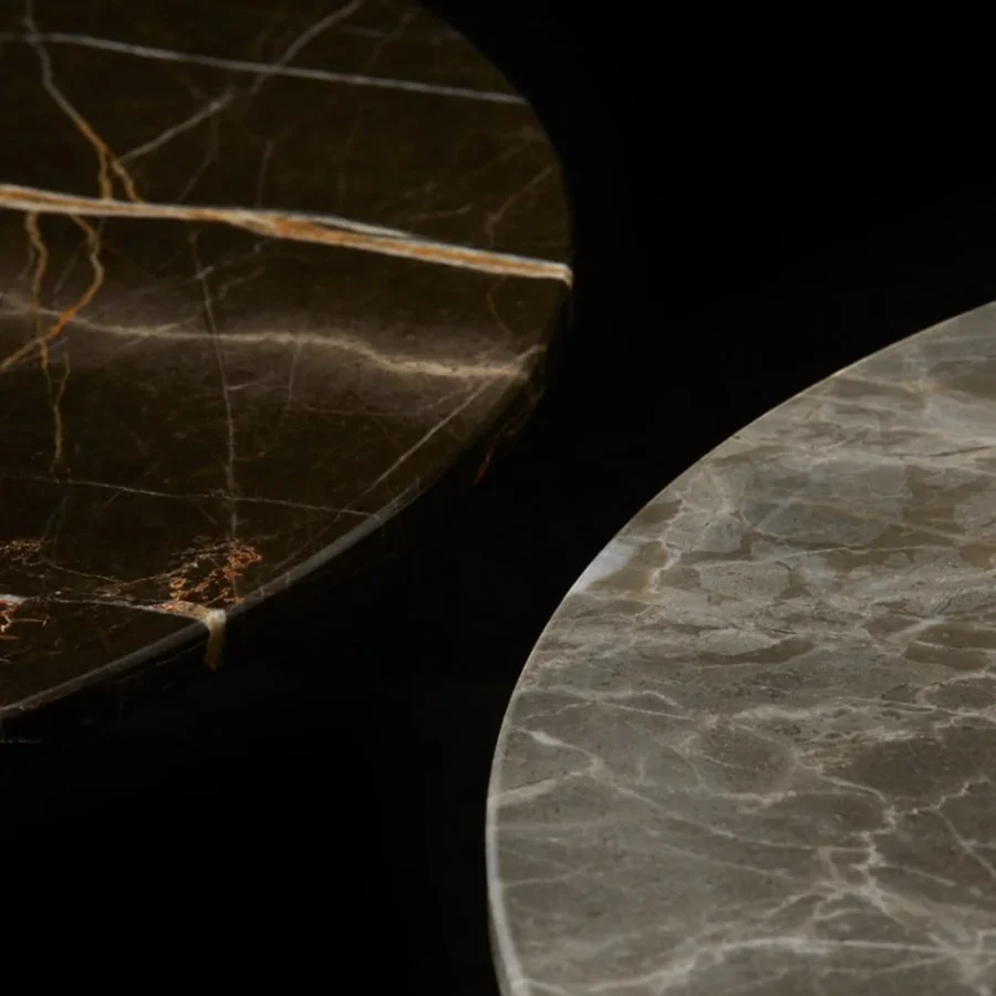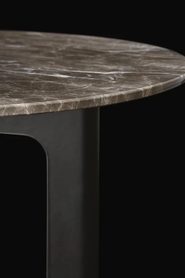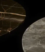 в благородной матовой отделке Brown Nickel opaco. Сдержанность металла эффектно подчеркивает роскошная столешница из натурального мрамора Saint Laurent в глянцевой полировке (glossy). Темный фон мрамора с выразительными светлыми прожилками превращает этот небольшой функциональный предмет в настоящий интерьерный акцент