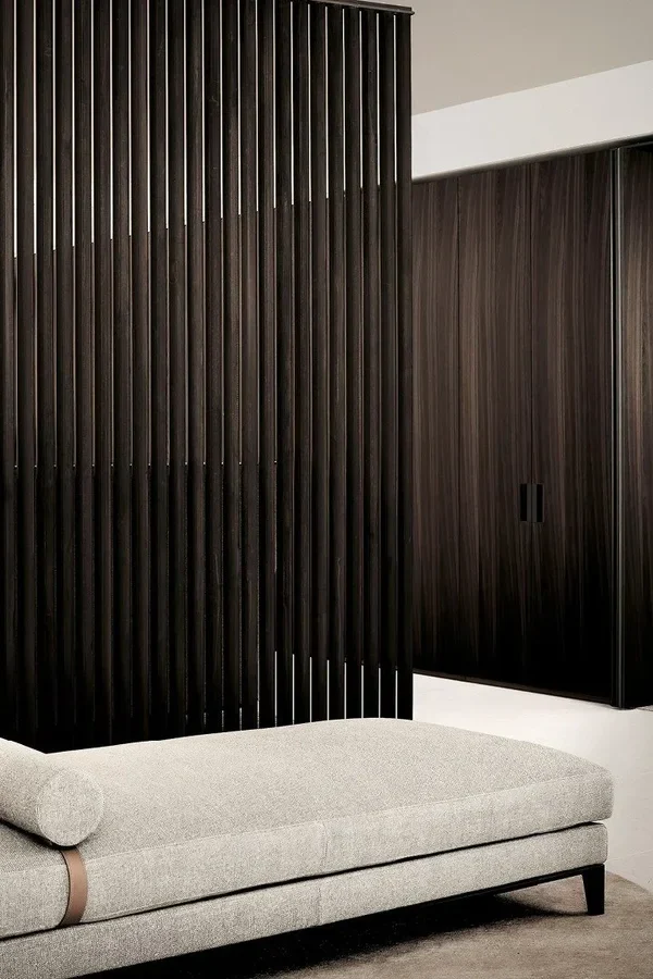 Вторая вариация гардеробной композиции Senzafine, представленная в салоне, продолжает философию элегантного и визуально легкого хранения, характерную для бренда Poliform. Архитектурная прочность и основательность конструкции достигаются за счет использования утолщенных боковых панелей. В этой модели ставка сделана на выразительный контраст: прозрачные рефлекторные стекла системы Ego (5000 Transparent reflective) стирают границы пространства и демонстрируют ваш гардероб в лучшем свете, тогда как глухие двери Match в теплой отделке Rovere Spessart создают уютную и спокойную атмосферу.