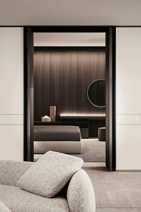 Гардеробная система Senzafine переосмысливает концепцию хранения, предлагая легкий и элегантный дизайн без ущерба для прочности, которая обеспечивается утолщенными боковыми панелями. Эта вторая вариация комбинированной композиции в нашем салоне виртуозно сочетает стеклянные витрины дверей Ego и древесную фактуру фасадов Match. Безупречное внутреннее оснащение с отделкой из экокожи и теплым встроенным светом превращает этот шкаф в настоящую архитектурную доминанту спальни.